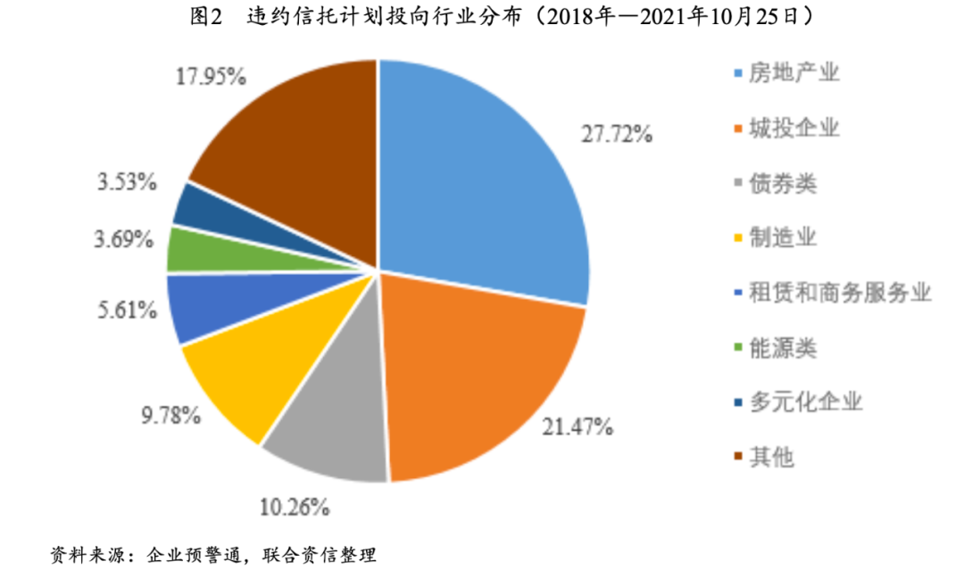工商行業作為信托資金投向的第一大行業(截至2021年9月底,工商企業共存續資金信托4.55萬億元,占比29.02%),但違約的信托計劃相對較少(制造業違約的信托計劃僅占比9.78%),與其體量匹配度不高。