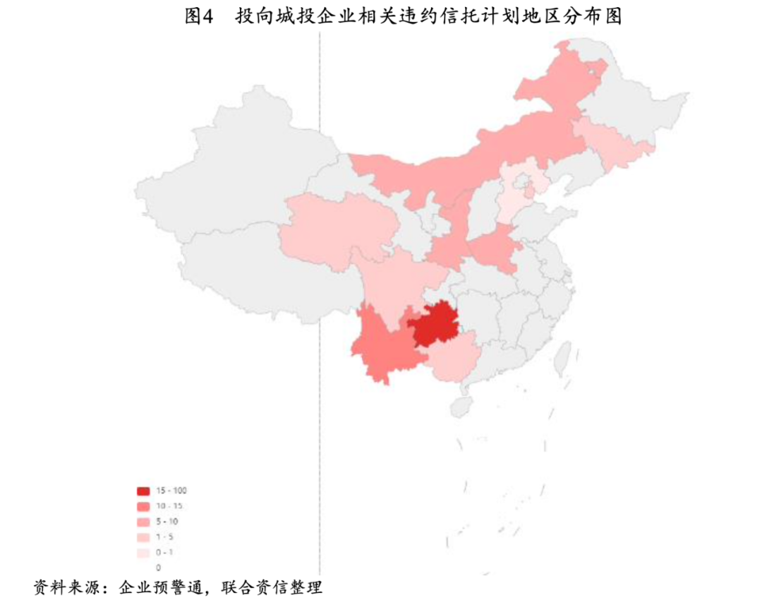 總體來看,自2019年以來,城投企業違約的信托計劃數量明顯減少。出現信托計劃違約的城投企業大多信用資質較低,地區主要分布在中西部省份的區縣地域;AAA級別的城投企業尚未出現信托計劃違約事件。