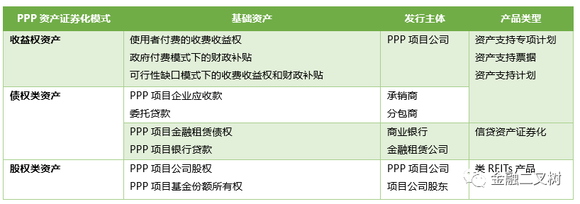 PPP項(xiàng)目資產(chǎn)證券化按照基礎(chǔ)資產(chǎn)分類可以分為收益權(quán)資產(chǎn)、債權(quán)資產(chǎn)和股權(quán)資產(chǎn)。不同的基礎(chǔ)資產(chǎn),對應(yīng)的資產(chǎn)證券化產(chǎn)品以及原始權(quán)益人(發(fā)行人)均有不同,具體如下表所示: