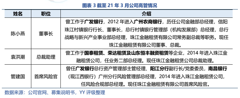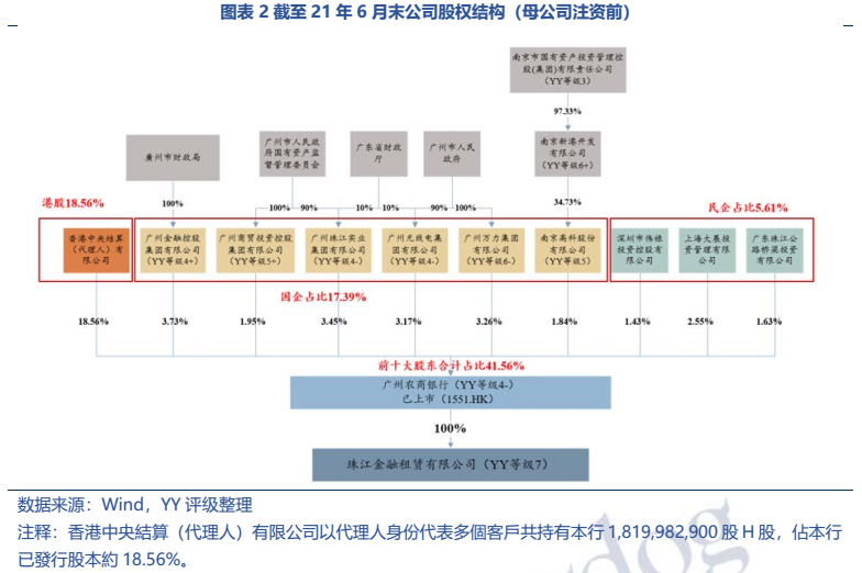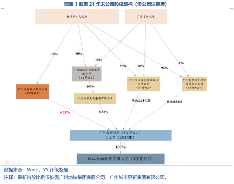 珠江金融租賃有限公司YY評(píng)級(jí)7,2014年成立,20年末總資產(chǎn)規(guī)模約167.49億元,體量較小。其母公司廣州農(nóng)商行19年在港股上市(1551.HK),21年末增資后,廣州地鐵以6.31%的持股取代廣州金控成為第一大股東。