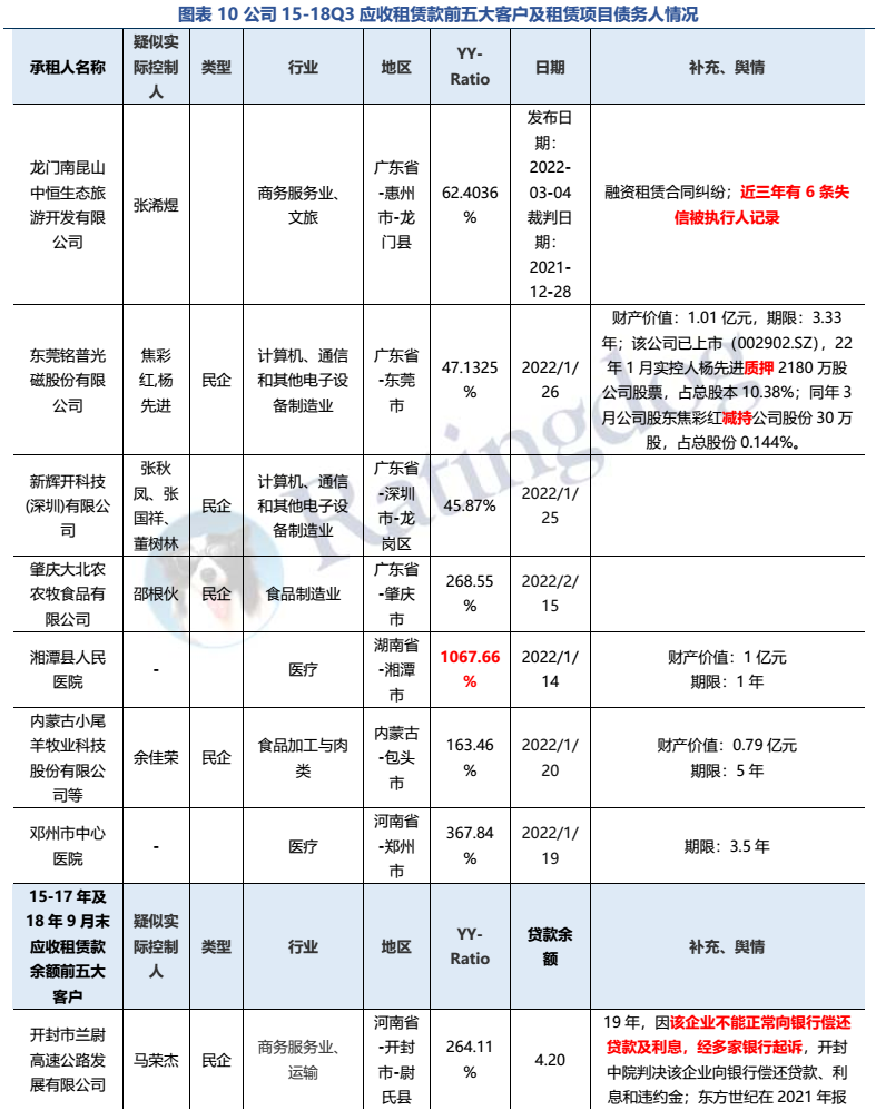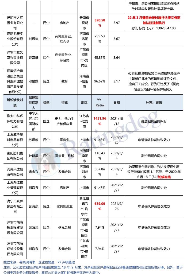 公司的主營(yíng)業(yè)務(wù)為金融租賃,定位于服務(wù)三農(nóng)、教育業(yè)(包括生豬行業(yè)、蛋雞行業(yè)以及K12 民辦教育市場(chǎng))。近年來公司資本充足率呈穩(wěn)步上升態(tài)勢(shì),但考量到公司信息披露較滯后,且受教育新規(guī)出臺(tái)和豬周期影響較大,上述板塊資產(chǎn)質(zhì)量有所承壓。進(jìn)一步對(duì)底層債務(wù)人進(jìn)行穿透,公司所投項(xiàng)目多集中在民企,且部份民企已被納入被執(zhí)行人,或是股票已被質(zhì)押。因此,從目前已有的信息可以推測(cè)公司當(dāng)前資產(chǎn)質(zhì)量有所承壓。