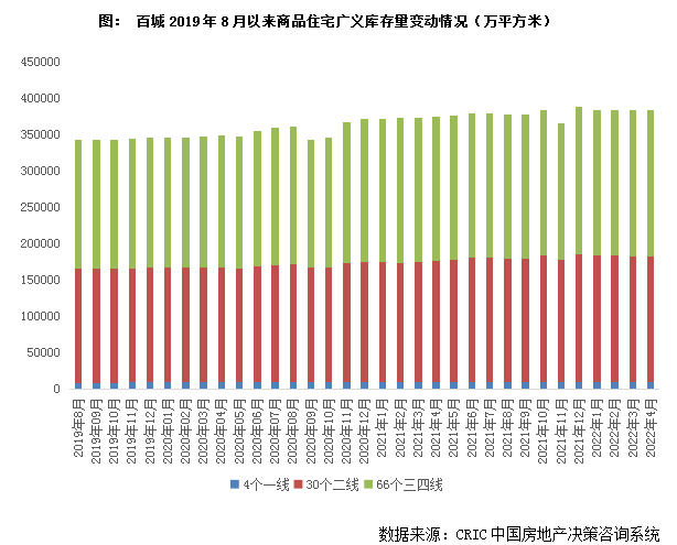 分能級來看,分化趨勢依舊:一線因疫情不確定影響,狹義庫存穩中有增,去化周期拉長至19.56個月,不過仍顯著低于百城平均,廣義庫存同環比齊降,庫存風險基本可控;二線“中規中矩”,廣、狹義庫存基本與上月持平,去化周期增至23.07個月,短期去化承壓。三四線庫存高企,狹義庫存、去化周期同比漲幅屬不同能級之首,顯著超百城平均,此外百城廣義庫存一半以上積壓在三四線城市,基數較大,短期內潛在庫存風險依舊較大。