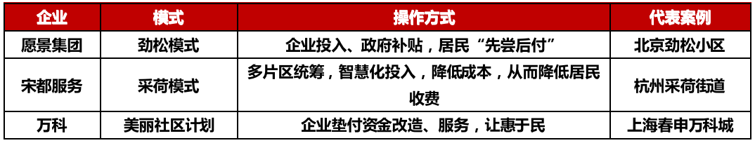 目前全國老舊小區改造的體量依然很大,完全依靠以政府為主導的準物業管理很不現實;老舊小區居民對高品質的物業服務仍有一定的需求,居民自治管理仍屬于治標不治本的暫時性解決方案;引入社會資本的模式一方面能緩解政府財政壓力,同時又能讓專業的物業企業參與進來,提升老舊小區的服務品質,愿景集團、宋都服務、萬科等企業已參與其中。