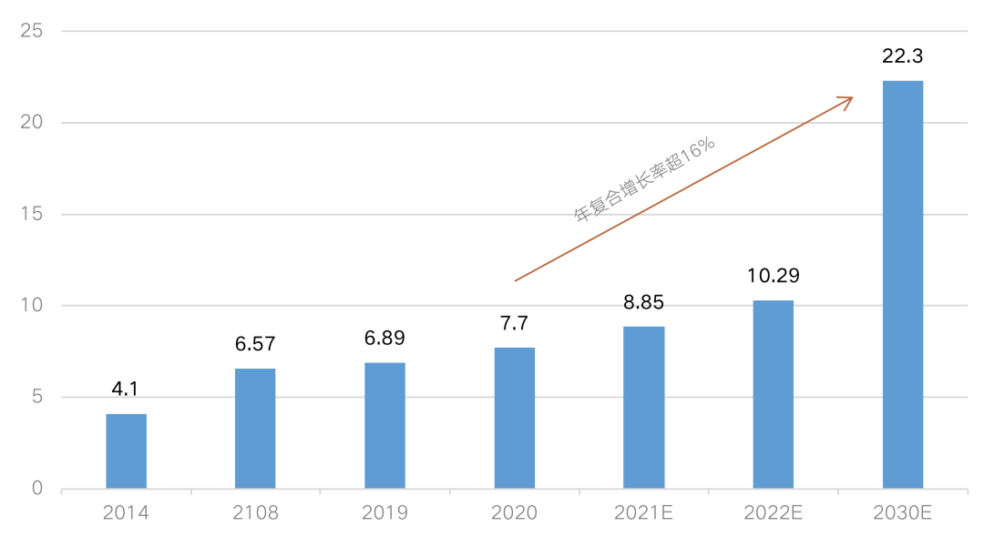 未來的10年,隨著建國后的第二代“嬰兒潮”即將步入老齡人群,養(yǎng)老市場將進入一個更加高速的增長階段。老年人口將是40后剛需老人、50后未富先老人群、60后邊富變老人群并存局面。預(yù)計在2030年,養(yǎng)老產(chǎn)業(yè)規(guī)模將超過22萬億元,年復(fù)合增長率將超過16%。