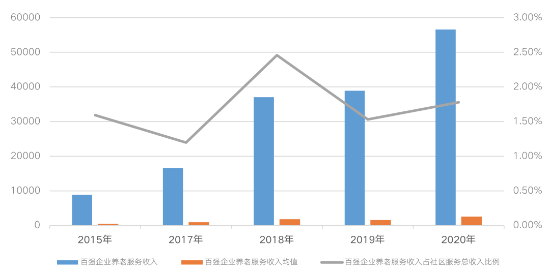 實際上,社區(qū)養(yǎng)老服務(wù)仍有很大的市場空間待挖掘。中物研協(xié)一組數(shù)據(jù)顯示,2020年百強企業(yè)社區(qū)養(yǎng)老服務(wù)收入占社區(qū)服務(wù)總收入的比例僅為1.78%,較2019年的1.53%增加0.85個百分點,社區(qū)養(yǎng)老服務(wù)收入正在逐步提高。