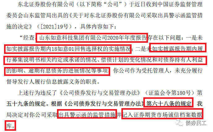 債券民工昨天在債券存續(xù)期受托管理很重要!兩家證券公司受處罰!一文中關(guān)注到,華西證券和宏信證券因債券存續(xù)期受托管理事項(xiàng)被證監(jiān)會(huì)四川監(jiān)管局處罰,今天就又看到了東北證券股份有限公司的公告,因未充分履行督導(dǎo)山東如意科技集團(tuán)有限公司2020年年度報(bào)告披露義務(wù),被證監(jiān)會(huì)山東監(jiān)管局局出具警示函的監(jiān)管措施。