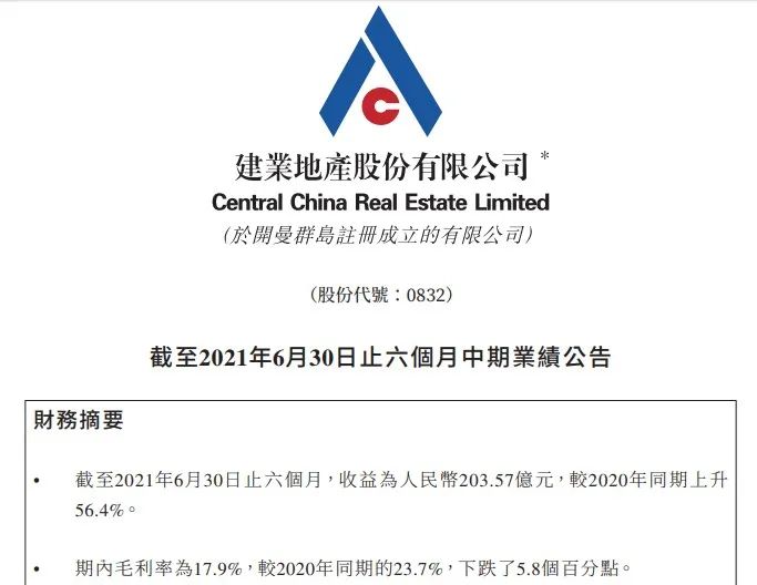 對了,建業(yè)地產(chǎn)的中期業(yè)績公告說: