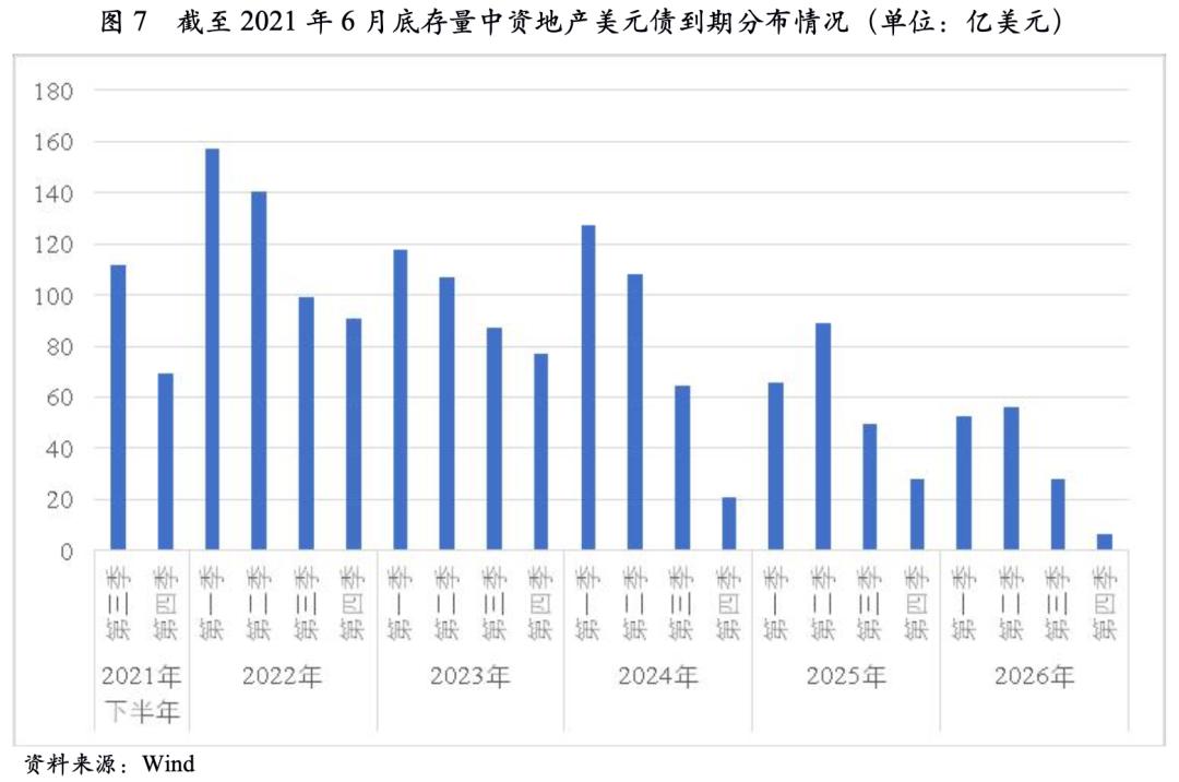 從未來的到期情況看,未來1年房企大量美元債密集到期。截至2021年6月底,未來12個月內(nèi)逾478億美元債務(wù)面臨到期,其中2022年1季度到期規(guī)模最大,再融資需求大。若市場持續(xù)大幅波動,將進(jìn)一步加劇房地產(chǎn)企業(yè)再融資壓力。