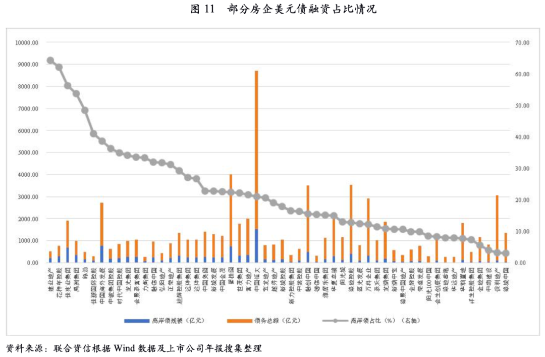 整體來看,大部分房企美元債占融資結(jié)構(gòu)的比重可控,且美元債市場市場化程度高,在市場認(rèn)可的合理價格范圍內(nèi)往往再融資可獲得性高,整體美元債信用風(fēng)險需結(jié)合企業(yè)基本面情況綜合考量。但部分房企融資結(jié)構(gòu)中美元債占比高,易受到境外債券估值波動影響,需關(guān)注其境外借新還舊壓力。