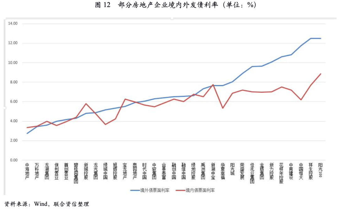 由于部分房地產(chǎn)企業(yè)綜合融資成本難以獲取,我們采用其債券發(fā)行票面利率作為篩選標(biāo)準(zhǔn)。我們以2020年以來,境內(nèi)外市場同時發(fā)行債券的企業(yè)為研究對象,對其發(fā)行債券的票面利率做簡單的算數(shù)平均進(jìn)行對比。考慮到境外美元債償債資金來源除借新還舊外,實(shí)質(zhì)來自于境內(nèi)公司,因此我們主要選取更能反映公司的真實(shí)信用風(fēng)險的境外控股公司作為分析標(biāo)的,詳見下圖。