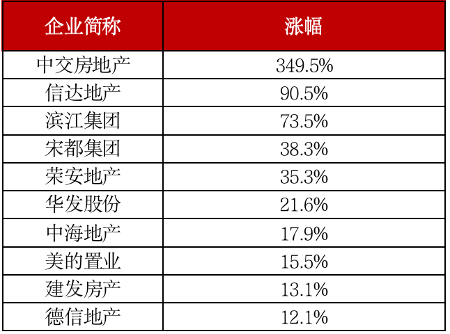 表:86家樣本房企年初至今股價(jià)漲幅前十排名