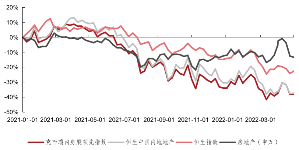 自2021年1月1日至4月底,克而瑞內(nèi)房股領(lǐng)先指數(shù)跌幅38.1%,同期恒生中國(guó)內(nèi)地地產(chǎn)指數(shù)跌幅37.4%,恒生指數(shù)跌幅22.6%,房地產(chǎn)(申萬(wàn))板塊跌幅13.4%。