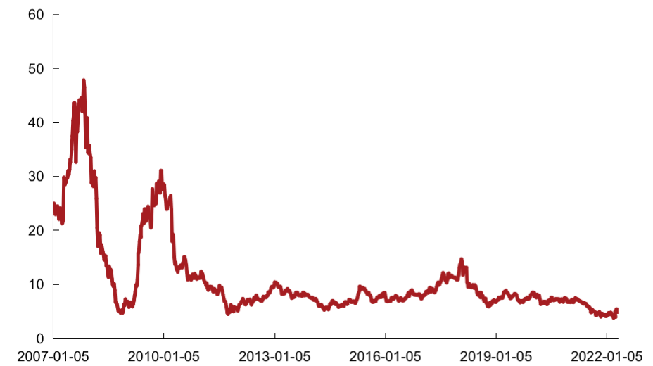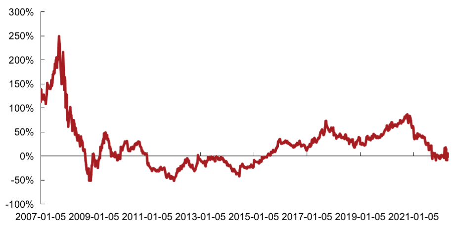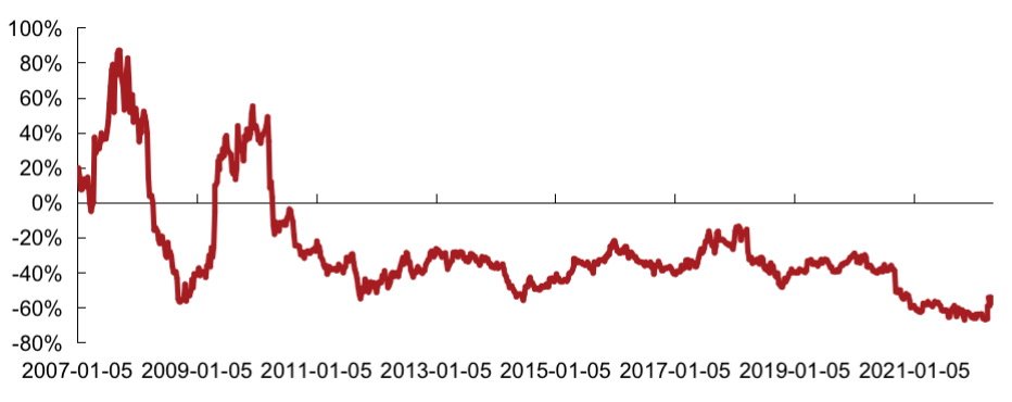 4月相對(duì)恒指PB周均值為2.4% ,低于上月的周均值7.2%,低于2021年全年相對(duì)恒指PB周均值22.5%。