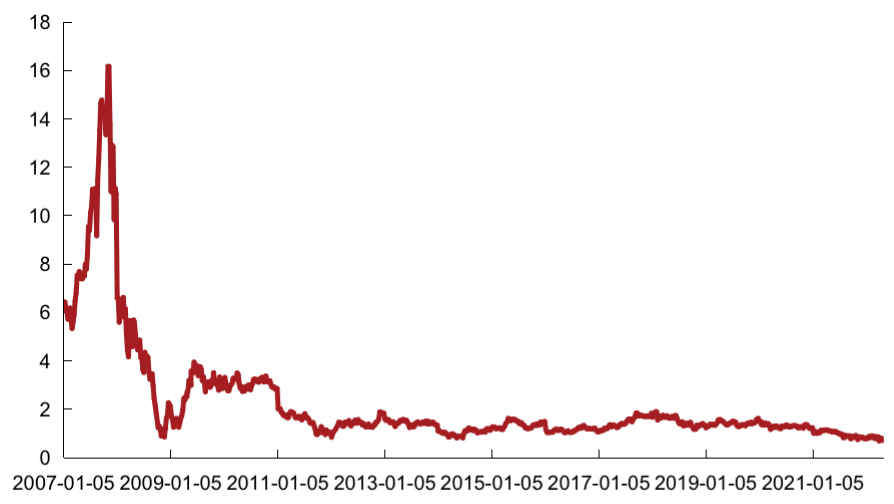 房股領(lǐng)先指數(shù)成分股PB相對(duì)恒指成分股4月出現(xiàn)較大幅度回落,月末至0.2%, 總體維持低位。