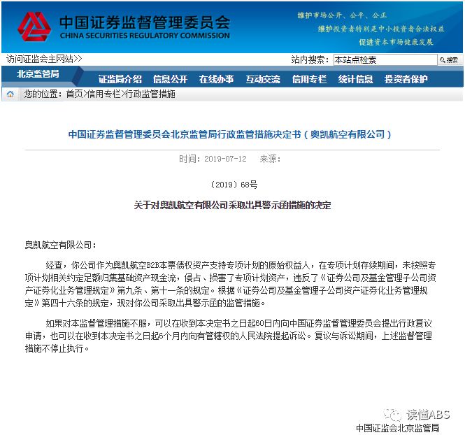 原標題: 北京證監(jiān)局對奧凱航空出具ABS警示函,未足額歸集現(xiàn)金流,侵占損害專項計劃資產(chǎn)!