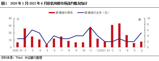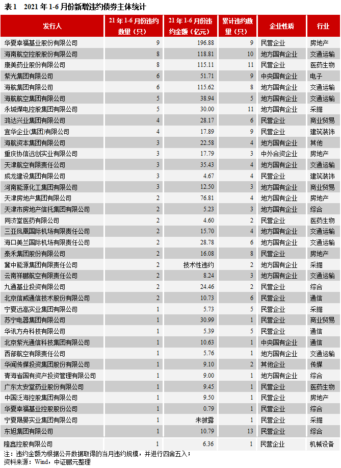 2021年上半年,延續(xù)2020年下半年的違約趨勢(shì),新增違約主體風(fēng)險(xiǎn)在前期已有所顯現(xiàn)。新增違約債券103只,違約規(guī)模約1,110億元,涉及37家發(fā)行人。其中,新增違約主體16家,違約債券35只,占比34%。與上年同期相比,新增違約債券增長(zhǎng)37%,新增違約主體下降27%,主要是海航系、華夏幸福等大型企業(yè)出現(xiàn)流動(dòng)性危機(jī),進(jìn)入債務(wù)重組,使得2月和3月違約債券增量較多。