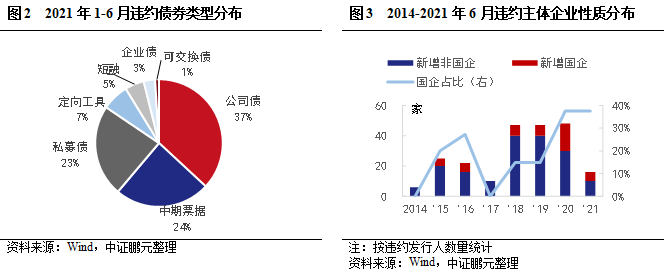 上半年違約特征:從違約類型看,新增違約債券中,2只為技術(shù)性違約,9只首次違約是因觸發(fā)交叉保護(hù)條款,其余92只均為實(shí)質(zhì)性違約。從違約事件看,53只為本金利息項(xiàng)違約,6只涉及回售款項(xiàng)違約,31只因破產(chǎn)觸發(fā)其他到期,9只觸發(fā)交叉保護(hù)條款,4只債券加速清償?shù)狡凇膫愋涂矗緜?8只、中期票據(jù)25只,私募債24只,三個(gè)券種合計(jì)占比84.5%,其余債券類型占比較小。從企業(yè)性質(zhì)看,16家新增違約主體中5家為地方國(guó)有企業(yè),1家為中央國(guó)有企業(yè),其余10家均為民營(yíng)企業(yè),國(guó)有企業(yè)數(shù)量占比37.5%,與上年持平。從上市情況看,16家新增違約主體中2家為上市公司,其余均為非上市公司。從處置方式看,24只債券發(fā)行人與持有人達(dá)成展期兌付協(xié)議,43只債券因發(fā)行人進(jìn)入破產(chǎn)重整程序而提前到期,其他債券均未公布兌付方案。從違約債券分布地區(qū)看,2021年違約債券主要分布在海南、廣東、河北,新增違約主體主要分布在河北、重慶和北京。