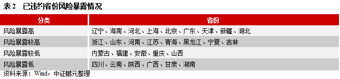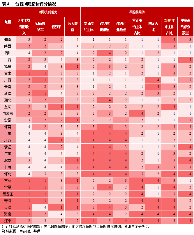 整體看,區(qū)域違約風(fēng)險(xiǎn),涉及因素較多,本文通過關(guān)鍵指標(biāo)的定量分析,對(duì)區(qū)域風(fēng)險(xiǎn)進(jìn)行劃分。需要注意的是,由于指標(biāo)有限性,區(qū)域劃分并非絕對(duì),在具體分析時(shí),需考慮相關(guān)調(diào)整因素。