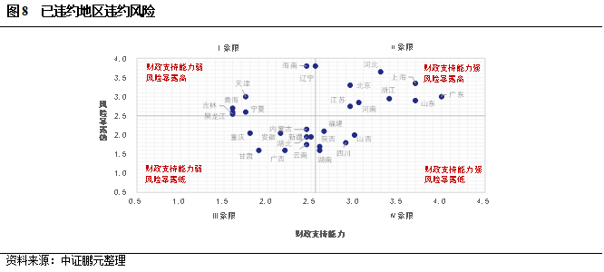 綜合財(cái)政支持能力和風(fēng)險(xiǎn)暴露情況看,將已違約省份可以分成4個(gè)區(qū)域:(1)Ⅰ象限:財(cái)政支持能力在均值以下,風(fēng)險(xiǎn)暴露值在均值以上,此區(qū)域內(nèi)省份普遍具有“財(cái)政收入規(guī)模小、財(cái)政自給率低、負(fù)債率高、國(guó)企違約占比高、存續(xù)主體數(shù)量少,2019年來出現(xiàn)違約的數(shù)量較多”的特征,部分違約主體存續(xù)債券規(guī)模較大,單家主體違約帶來的負(fù)面影響較為明顯。相對(duì)來說,此區(qū)域的風(fēng)險(xiǎn)值最高。(2)Ⅱ象限:財(cái)政支持能力在均值以上,風(fēng)險(xiǎn)暴露值在均值以上,此區(qū)域內(nèi)省份普遍具有“財(cái)政收入規(guī)模大、政收入增速較高、財(cái)政自給率高、政府債務(wù)率較低、但違約行業(yè)和年份較多,民企占比高,單家主體違約債券數(shù)量較多”的特征。此區(qū)域,有地方政府財(cái)力支持,區(qū)域內(nèi)融資環(huán)境較好,民營(yíng)企業(yè)債券融資比例較高,隱藏風(fēng)險(xiǎn)覆蓋面較廣。(3)Ⅲ象限:財(cái)政支持能力在均值以下,風(fēng)險(xiǎn)暴露值在均值以下,此區(qū)域內(nèi)省份普遍具有“財(cái)政收入規(guī)模中等、財(cái)政自給率較低、但收入增速較高,國(guó)企占比低、違約行業(yè)和年份較少、單家主體違約數(shù)量相對(duì)較小”的特征。部分省份存續(xù)的債券主體較少,單家違約帶來的負(fù)面影響較大。與Ⅱ象限相比,Ⅲ象限違約主體數(shù)量較小,部分省份債務(wù)率偏高,雖然存續(xù)的主體相對(duì)較少,但在政府債務(wù)壓力較大的時(shí)期,政府對(duì)有限風(fēng)險(xiǎn)主體的支持依然存在一定壓力,尤其是財(cái)政自給率較低的省份。(4)Ⅳ象限:財(cái)政支持能力在均值以上,風(fēng)險(xiǎn)暴露值在均值以下,此區(qū)域風(fēng)險(xiǎn)相對(duì)較小。此區(qū)域內(nèi)省份普遍具有“財(cái)政收入規(guī)模中等但增速高,違約行業(yè)和主體集中度較低”的特征。相對(duì)來說,此區(qū)域的風(fēng)險(xiǎn)最小,但由于財(cái)政實(shí)力整體靠近均值,省內(nèi)部分區(qū)域財(cái)政壓力依然較大,存在財(cái)力不足的現(xiàn)象。
