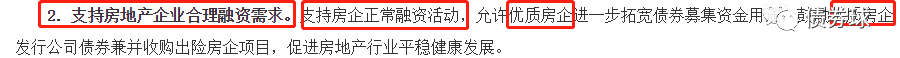 這一條重點自然不在“支持房企正常融資活動”,作為官方機構,如果連正常融資活動都不支持,肯定不合適。對于這部分,筆者關注的重點在于“優質房企”。從具體內容來看,如果發行人被認定為優質房企,其將獲得的政策支持是毫無疑問的??上У牡胤皆谟?,這里并沒有給出優質房企的標準,大概監管部門也有難為的地方吧。