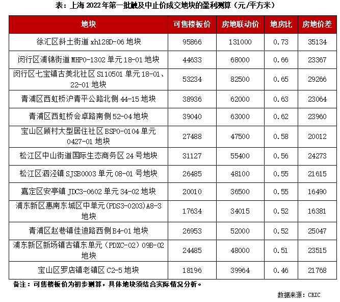 以觸及中止價格的13幅地塊來看。13幅地的平均地房比達0.58,略高于36宗地的平均地房比,但平均房地價差也2.3萬元/平方米以上,盈利空間仍然充裕。以此次成交樓板價最高的徐匯區斜土街道xh128D-06地塊來看,雖然剔除配套公建后該宗地可售地價超過9.5萬元/平方米,但其所在的徐匯濱江片區是上海房價的天花板,商品住宅限價達13.1萬元/平方米,因此項目的房價地價差高達3.5萬元/平方米以上,項目仍留有一定的盈利空間。