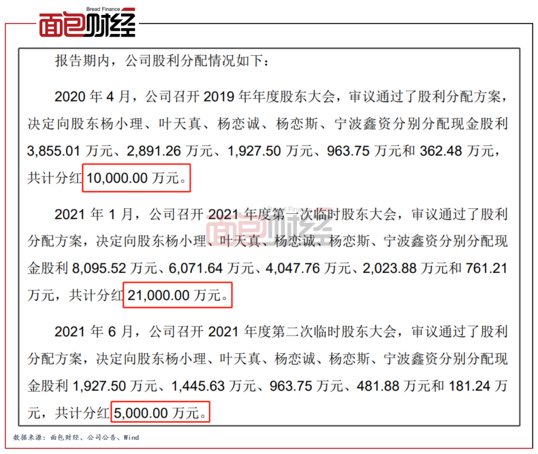 2020年4月,公司召開2019年年度股東大會,決定分配現金股利共計1億元,分紅金額超出2019年度公司歸母凈利潤近87萬元;2021年1月和6月,公司召開兩次臨時股東大會,共分配現金股利2.6億元,分紅金額超出公司2021年上半年歸母凈利潤近1.2億元。按照楊小理、葉天真夫婦及其子女所持股份比例計算,四人通過三次分紅獲得近3.55億元。