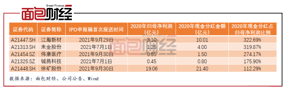 不僅僅是海特克動力,擬上市前的高比例分紅也成為不少企業的選擇。以2021年下半年報送IPO申報稿的企業為例,據不完全統計,有5家企業在2020年的現金分紅金額占該年度歸母凈利潤的比例達100%以上。其中江瀚新材在2020年現金分紅逾10億元,占該年度歸母凈利潤的比例達3倍。