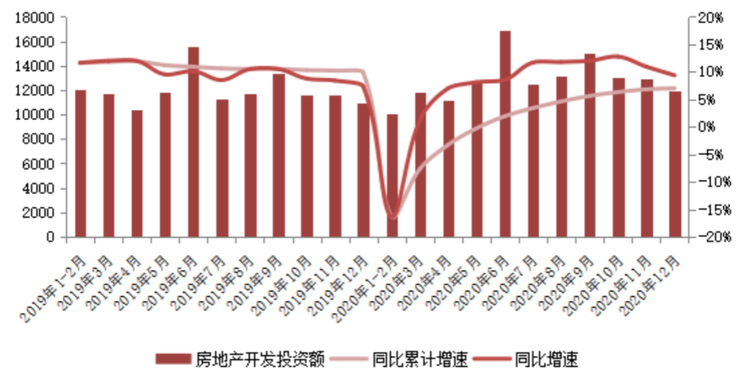 國家統(tǒng)計局數(shù)據(jù)顯示:2020年,全國房地產(chǎn)開發(fā)投資額141443億元,同比增長7%。單月開發(fā)投資規(guī)模的收窄使得全年累計規(guī)模增速出現(xiàn)“降速”,前12月僅較前10月漲幅僅提高0.7pts。