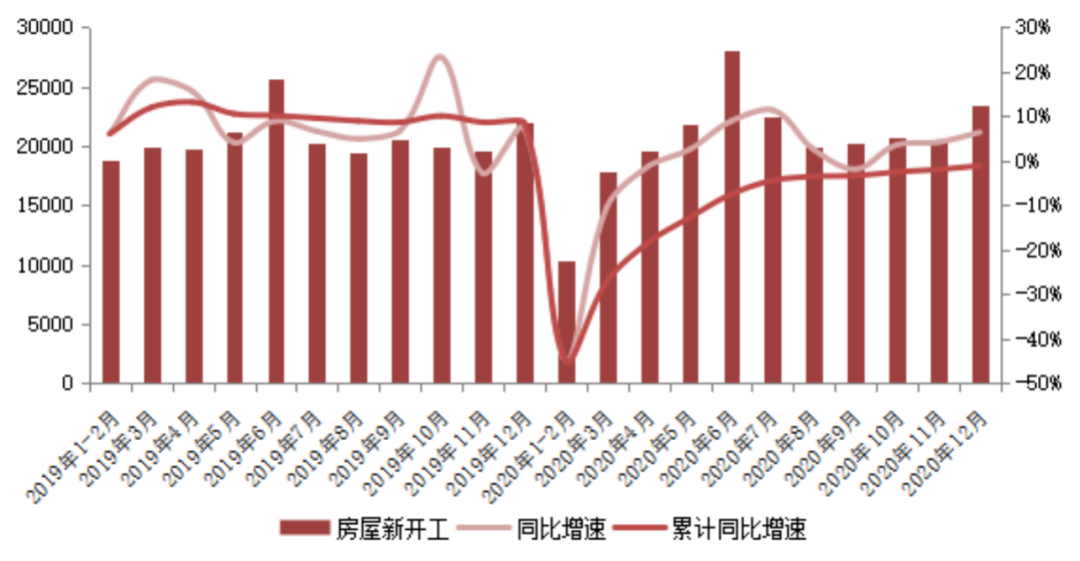 2020年房企房屋新開工面積在“三條紅線”出臺后便相應止升回落。下半年新房市場銷售表現(xiàn)不及預期使得房企對未來預期看淡。同時融資收緊下房企資金問題短期內(nèi)難以發(fā)生根本轉(zhuǎn)變,房企對開工進度與施工強度的抉擇將受到持續(xù)影響。由于2020年房企土地購置面積依舊呈負增長,因此預計2021年可待開發(fā)土地規(guī)模有限,將拖累新開工指標,2021年新開工面積規(guī)模將繼續(xù)低位,但相比于2020年同比有望正增長,主要由于2020年規(guī)模較低且負增長,前值較低。