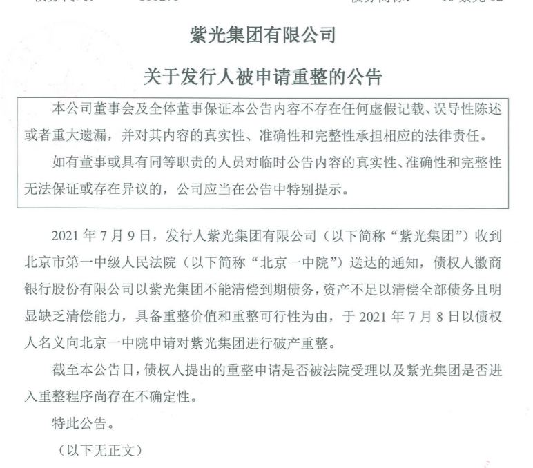 1、紫光集團(tuán)公告,被債權(quán)人徽商銀行申請(qǐng)破產(chǎn)重整。經(jīng)過違約之前的掙扎(各地政府都忽悠了一遍),違約后的自救(傳移動(dòng)、阿里之類要重組他),都以失敗告終,看來只能清算了。這段時(shí)間紫光的成交價(jià)30+,不知道破產(chǎn)清算的回收率如何,看著夠嗆。
