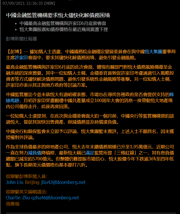 2、彭博報(bào)導(dǎo)金融監(jiān)管機(jī)構(gòu)要求恒大盡快化解債務(wù)困境。金穩(wěn)委官員敦促許家印引入戰(zhàn)投等方式化解債務(wù)問題。昨天就傳中化下面的金茂和恒大有談,但是恒大辟謠了。