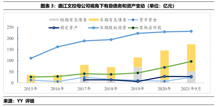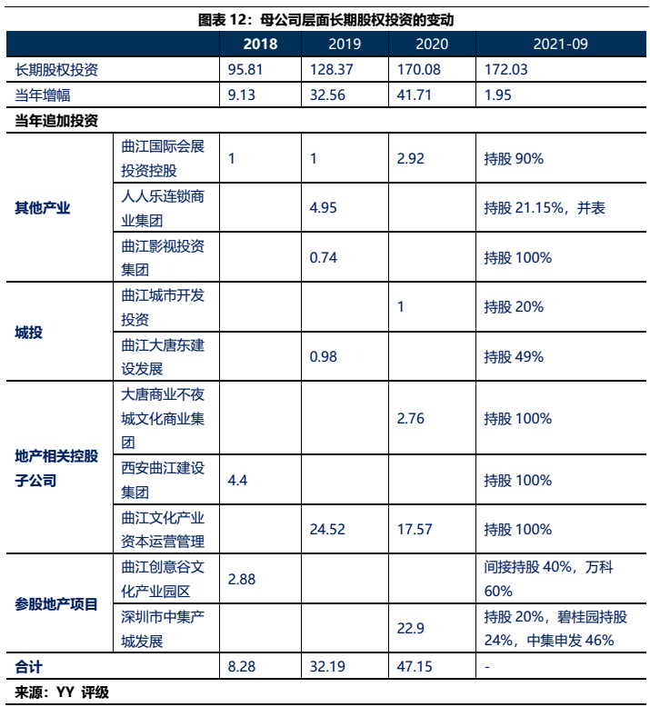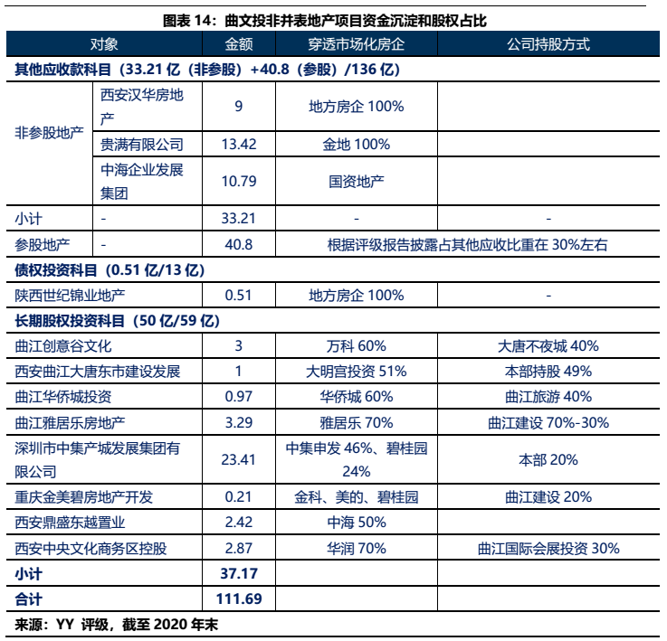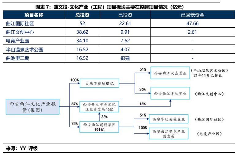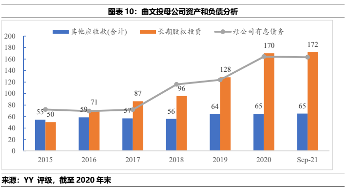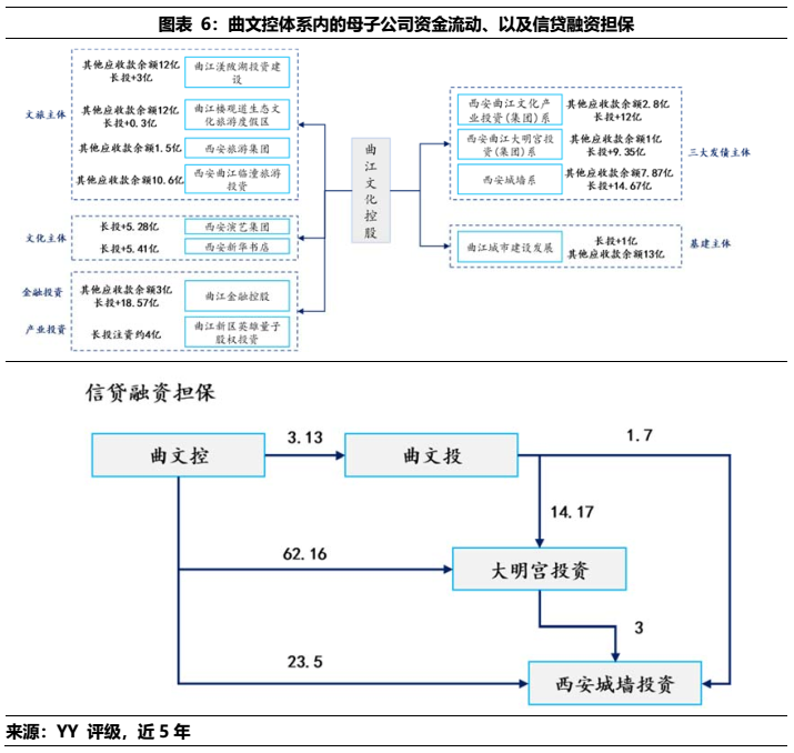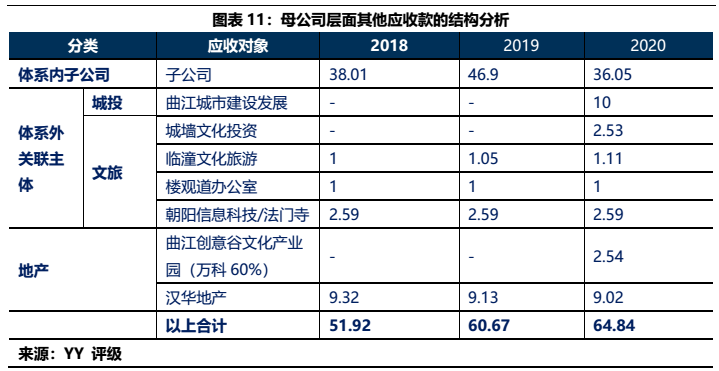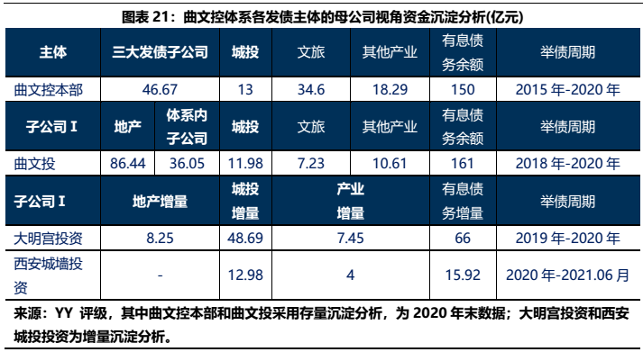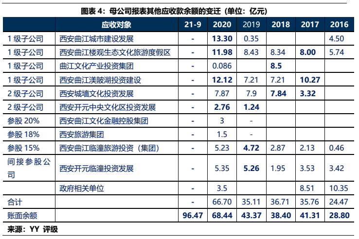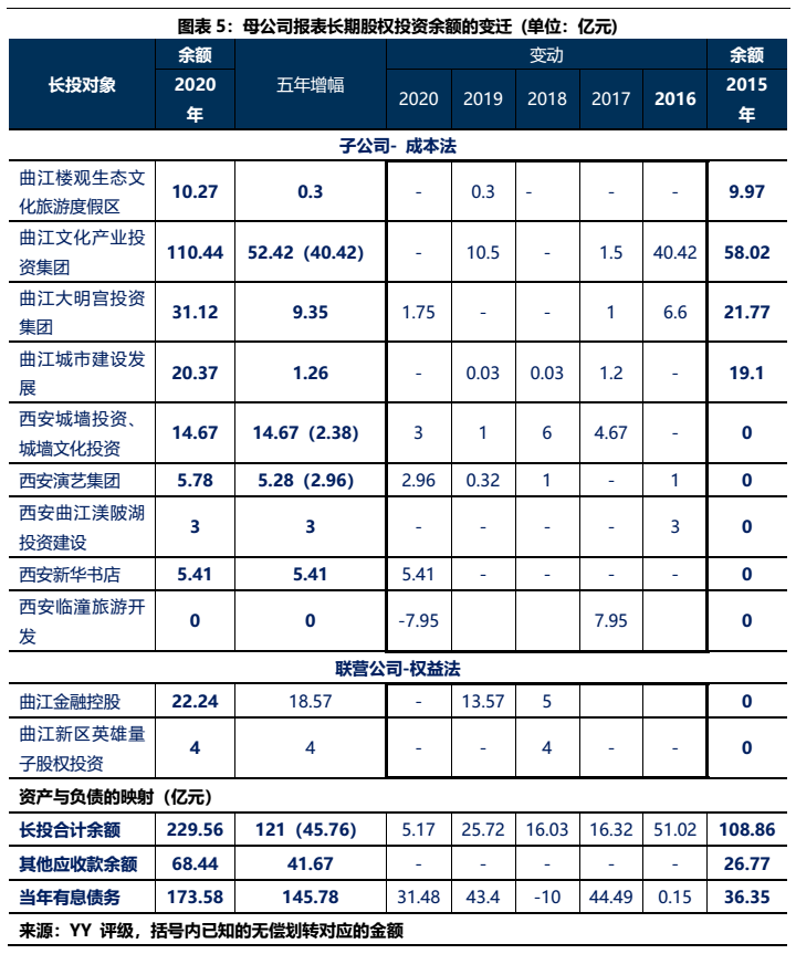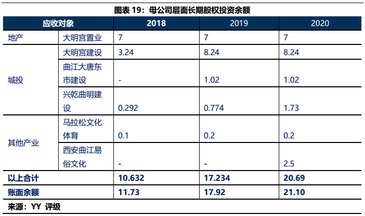 1)本部5年內(nèi)的資金沉淀,主要以應收款和長投注資的形式沉淀于三大發(fā)債主體(曲文投、大明宮投資和西安城墻合計應收11億,長投增加35億),文旅類主體(樓觀道建設、臨潼旅游和渼陂湖建合計應收34億),文化主體(西安演藝和新華書店合計收購7.8億),基建(曲江城市建設應收13億)以及產(chǎn)業(yè)控(曲江金控注資6.57億,英雄量子股權(quán)投資注資4億)等。