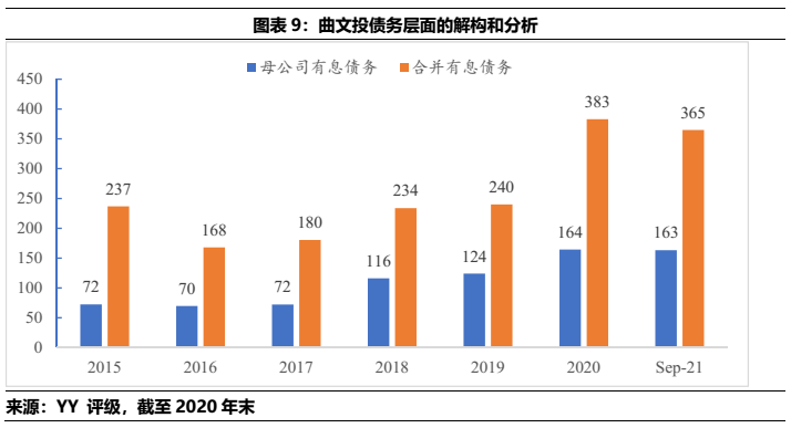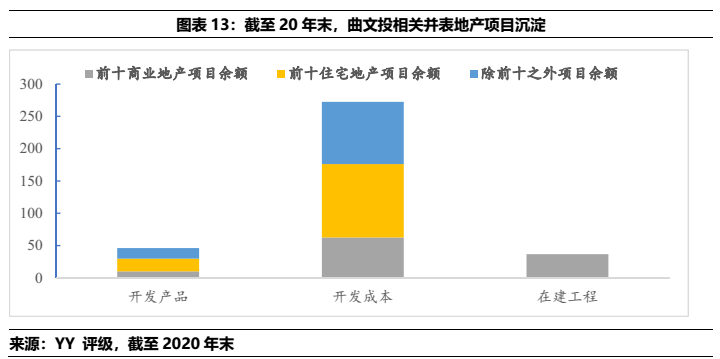 2)曲文投而言,屬于弱城投屬性主體,母公司層面資金沉淀于體系內(nèi)子公司(36.05億)、地產(chǎn)相關(guān)(86.44)、城投相關(guān)(11.98億),文旅(7.23)和其他產(chǎn)業(yè)(10.61億)等;合并報表而言,涉房資產(chǎn)的體量下限值(332.69億)扣除預售后(130億)占合并報表有息債務(382億)的比重在53%左右。
