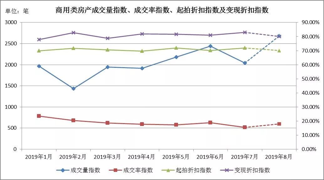 (一) 商用類房產(chǎn):成交量、成交率雙降,起拍折扣指數(shù)、變現(xiàn)折扣指數(shù)微升