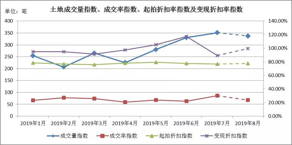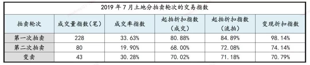 趨勢分析:7月土地類資產(chǎn)成交量為351筆,連續(xù)第三個(gè)月增長,但增速有所放緩,預(yù)測8月將有小幅下降趨勢;成交率為30.09%,較6月大幅上升,增長八個(gè)百分點(diǎn),說明土地資產(chǎn)的流動(dòng)性有所提升;起拍折扣指數(shù)為76.62%,基本與6月持平;變現(xiàn)折扣指數(shù)為89.32%,出現(xiàn)今年以來首次大幅度下跌,跌破90%,為今年最低點(diǎn)。結(jié)合成交率的大幅增長趨勢分析,在土地交易中投資人占據(jù)主動(dòng),賣方為盡快成交降低價(jià)格出售資產(chǎn);值得提醒的是,同工業(yè)類房產(chǎn),土地交易的單筆金額大,市場規(guī)模占比較小,稍有波動(dòng)就會(huì)形成比較明顯的交易數(shù)據(jù)。