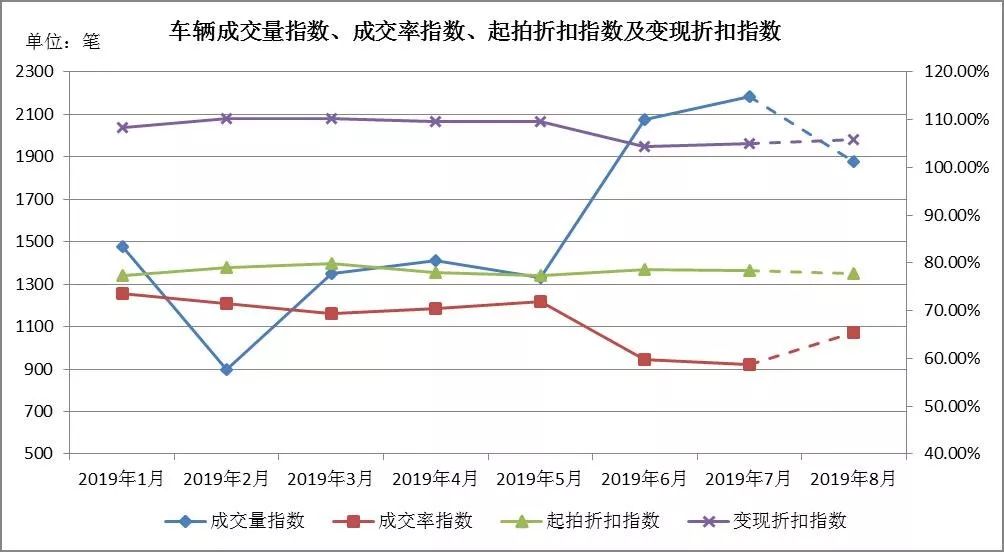 趨勢分析:7月車輛成交量為2182筆,小幅增長,增速較6月放緩,預(yù)測8月有回落趨勢;成交率為58.65%,較6月下降一個(gè)百分點(diǎn);起拍折扣指數(shù)為78.34%,基本與上月持平;變現(xiàn)折扣指數(shù)為105.02%,小幅增長。
