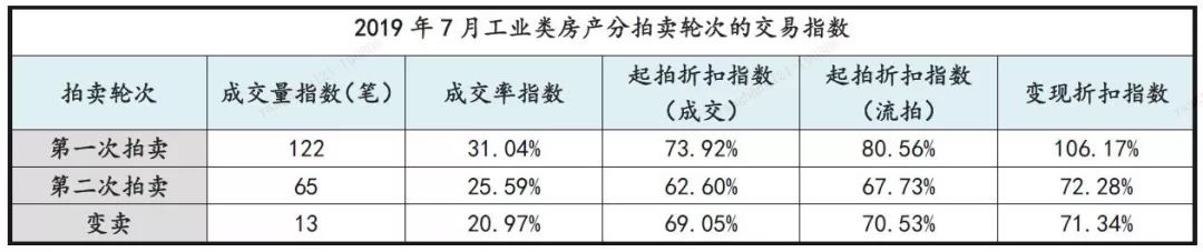 趨勢分析:7月工業(yè)類房產(chǎn)成交量200筆,較6月減少70筆,下降幅度較大,工業(yè)類房產(chǎn)因非標(biāo)標(biāo)準(zhǔn)化程度高,單筆金額較大,此類資產(chǎn)所占市場規(guī)模較小,稍有波動(dòng)就會(huì)形成比較顯著的數(shù)據(jù);成交率為28.62%,較6月下降四個(gè)百分點(diǎn);起拍折扣指數(shù)為69.92%,基本保持穩(wěn)定,有小幅下降趨勢;變現(xiàn)折扣指數(shù)為92.89%,較6月下降三個(gè)百分點(diǎn),仍有進(jìn)一步下降的趨勢。