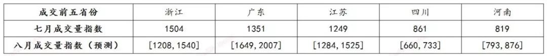 趨勢分析:7月在成交量上浙江省穩(wěn)步增長,超越廣東省,排名第一;廣東省成交量出現(xiàn)大幅下降,環(huán)比下降17%;四川省與河南省的成交量都有所增加,四川省增幅較大,超越河南省,躍居第四,市場預(yù)期較好。從成交量走勢來看,浙江省與廣東省波動(dòng)較為頻繁,特別是廣東省,每月的成交量變化較快。