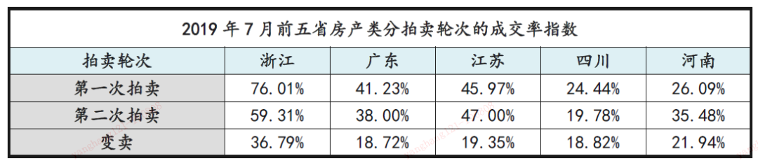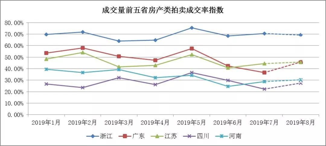 趨勢分析:7月的五省成交率變化有所差異,浙江省微升兩個(gè)百分點(diǎn),江蘇省與河南省小幅增加4%,廣東省與四川省的成交率明顯下降。廣東省成交量與成交率雙降,說明市場處于低迷狀態(tài),交易難度提升;四川省的成交量增加但成交率仍在下降,說明市場四川省的資產(chǎn)量多投資人相對較少,呈現(xiàn)明顯的買方市場。