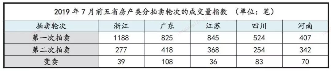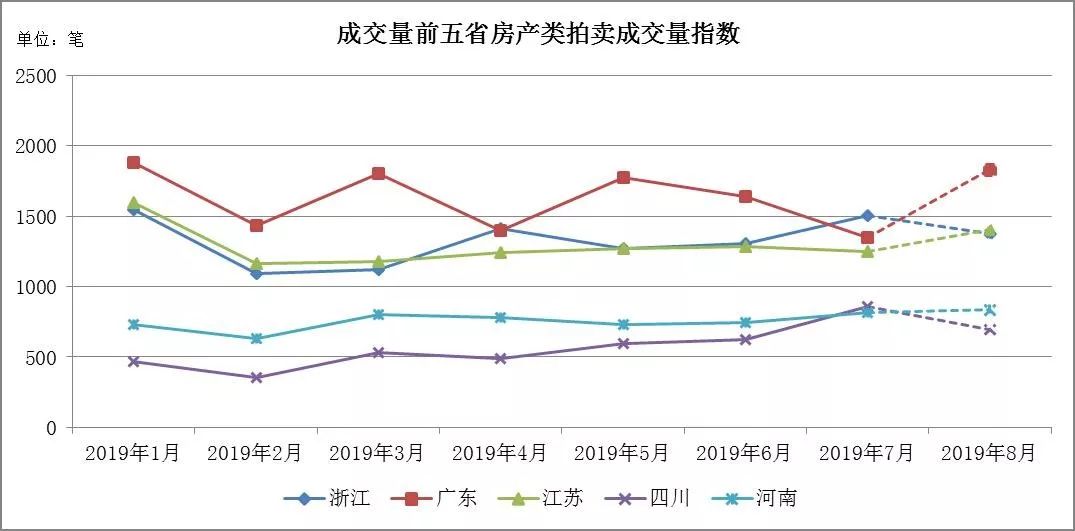 本部分展示2019年7月成交量排名前五省份的房產(chǎn)類成交量指數(shù)、成交率指數(shù)、起拍折扣指數(shù)與變現(xiàn)折扣指數(shù)。7月份成交量前五省為(從大到小):浙江、廣東、江蘇、四川、河南。相較于6月,浙江超越廣東排名第一,四川超越河南,躍居第四。