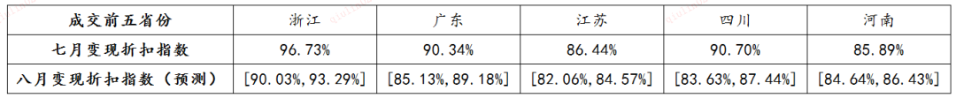 趨勢分析:7月浙江省、江蘇省變現(xiàn)折扣指數(shù)增幅較大,另三省呈下降趨勢。其中,浙江省的增幅最大,較6月增長3%,江蘇省在連續(xù)兩個(gè)月的下降后,7月變現(xiàn)折扣指數(shù)有所提升。整體來看,未來五省的變現(xiàn)折扣指數(shù)預(yù)期呈下降趨勢。