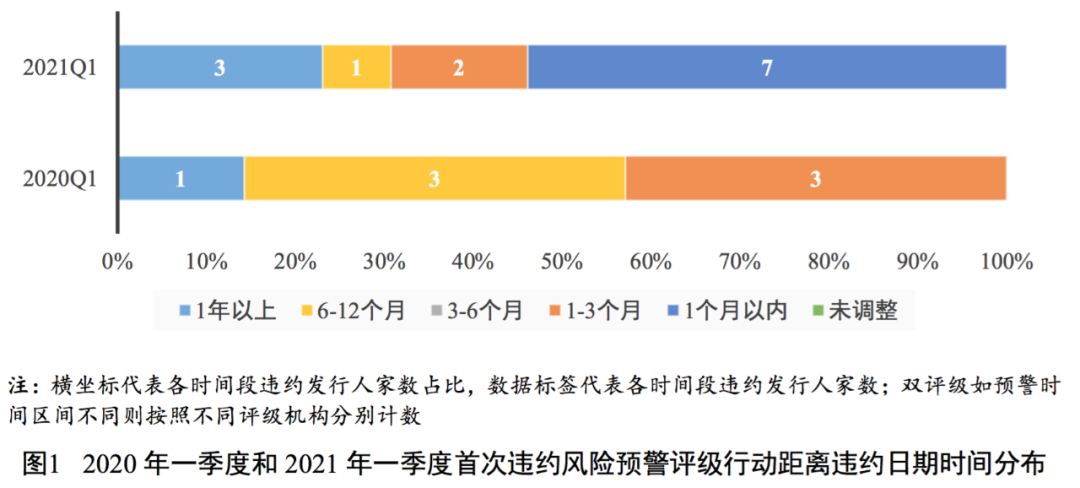 2021年一季度,我國債券市場13家新增違約發(fā)行人中有12家在違約前具有有效信用等級,違約事件發(fā)生前評級機構(gòu)均通過各類評級行動進行了風險預警[7],首次違約風險預警評級行動日期距離違約日期時間在1個月以內(nèi)的有7家,1~3個月(含)的有2家,6~12個月(含)的有1家,1年以上的有3家。整體來看,2021年一季度信用評級的預警及時性較2020年一季度有所下降,主要系海航集團流動性危機較早爆發(fā)且風險處置工作復雜,部分海航系發(fā)行人因技術(shù)性因素(無法提供跟蹤評級所需資料等)導致評級預警動作滯后。