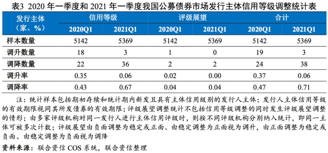 2021年一季度,我國公募債券市場共有39家(多評級分別統(tǒng)計,下同)發(fā)行主體信用等級發(fā)生調(diào)整,調(diào)整率為0.73%,較2020年一季度(0.69%)略有上升;其中,信用等級被調(diào)升的發(fā)行主體有3家,調(diào)升率為0.06%,較2020年一季度(0.28%)下降0.22個百分點,信用等級被調(diào)降的發(fā)行主體有36家,調(diào)降率為0.67%,較2020年一季度上升0.26個百分點。整體來看,2021年一季度公募債券市場評級穩(wěn)定性變化不大,但發(fā)行主體信用等級調(diào)降趨勢有所強化。