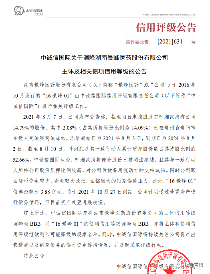 8月17日,中誠信國際公告稱,決定將景峰醫(yī)藥(000908.SZ)主體和“16景峰01”的債項信用等級由“A”調(diào)降至“BBB”,并列入可能降級的觀察名單。