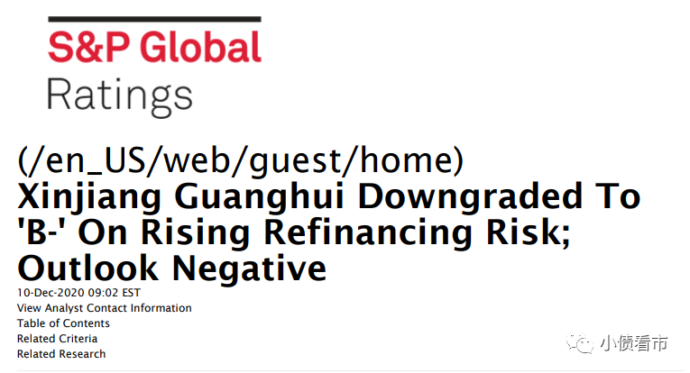 12月10日,標普報告稱,將新疆廣匯實業投資(集團)有限責任公司(以下簡稱“廣匯集團”)的長期發行人信用評級從“B”下調至“B-”;同時將其高級無抵押票據的長期發行評級從“B-”下調至“CCC+”。