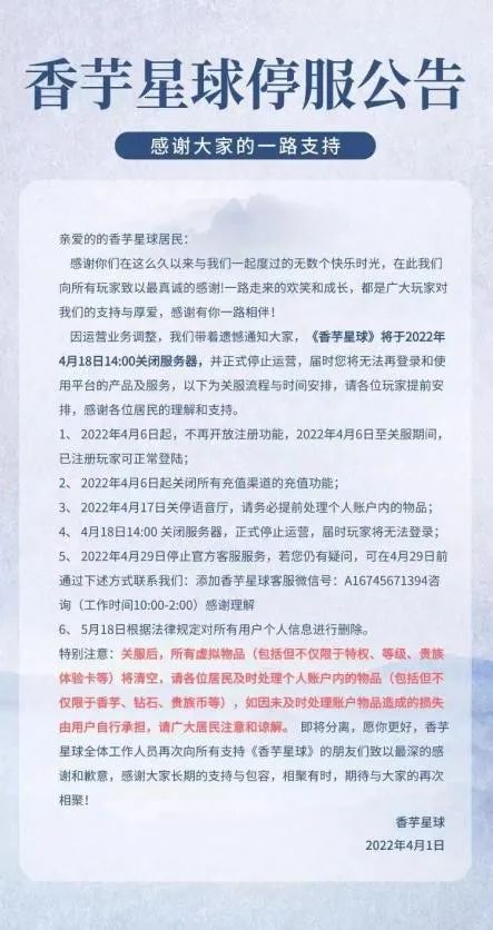 傳統(tǒng)游戲領(lǐng)域的侵權(quán)行為中,涉及虛擬財產(chǎn)的案件占了主導(dǎo)。在游戲中,玩家以一定的資金購買裝備、道具、角色等虛擬財產(chǎn),并在游戲中享有使用權(quán),但實際上這些虛擬財產(chǎn)只是呈現(xiàn)出來的視覺效果,根本上來說只是一串代碼,而非實實在在的物件。盡管游戲所營造出虛擬空間中的財產(chǎn)并不具有直接的經(jīng)濟價值,但一旦受到侵犯,必定會損害玩家的合法權(quán)益。對于玩家虛擬財產(chǎn)的侵犯,有以下三種可能:其一,是黑客進入系統(tǒng)篡改了玩家的游戲數(shù)據(jù);其二,是其他玩家以某種手段破壞了賬戶(例如盜號);其三,則是游戲停服,使得玩家的財產(chǎn)被迫消失,例如香芋星球在停服通告中表示,所有玩家的物品都將被清空。
