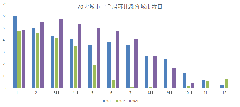 其次,此輪地產(chǎn)降溫前,房地產(chǎn)需求端數(shù)據(jù)好于前兩輪(2011、2014)。從圖中可以看到,在降溫前,當(dāng)前房價(jià)上漲城市數(shù)目是明顯高于2011和2014年的。