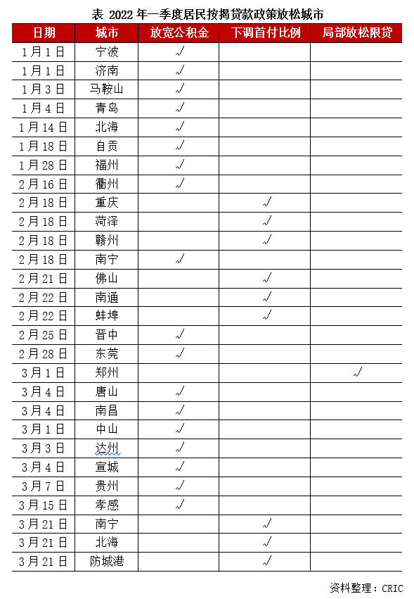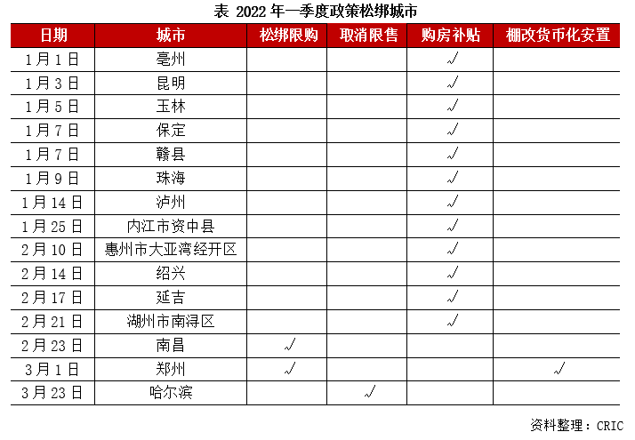 2022年一季度,中央多部委密集表態(tài)穩(wěn)地產(chǎn),財(cái)政部明確今年內(nèi)不具備擴(kuò)大房地產(chǎn)稅改革試點(diǎn)城市的條件,兩會(huì)定調(diào)探索行業(yè)新發(fā)展模式,支持新市民等三類購(gòu)房需求。房企融資、預(yù)售資金監(jiān)管適度松綁,并購(gòu)貸不計(jì)入“三道紅線”、保障性租賃住房貸款不計(jì)入“兩道紅線”、全國(guó)性商品房預(yù)售資金監(jiān)督管理辦法出臺(tái)。居民按揭貸款政策邊際改善,各地放寬公積金貸款、下調(diào)首付比例、局部放松限貸、下調(diào)房貸利率。15城出臺(tái)新政刺激購(gòu)房需求,重點(diǎn)涉及松綁限購(gòu)、取消限售、發(fā)布購(gòu)房補(bǔ)貼、棚改貨幣化安置等。