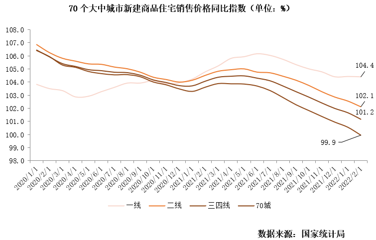 1-2月商品房銷售均價(jià)為9845元/平方米,環(huán)比上升3%,同比下降11%。2月70個(gè)大中城市新建商品住宅銷售價(jià)格同比上升1.2%,其中三四線城市同比下降0.1%。