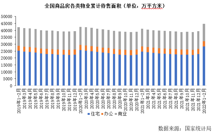 國(guó)家統(tǒng)計(jì)局公布數(shù)據(jù)顯示,2月末,商品房待售面積57026萬(wàn)平方米,比2021年末增加6003萬(wàn)平方米。其中,住宅待售面積增加5552萬(wàn)平方米,辦公樓待售面積增加104萬(wàn)平方米,商業(yè)營(yíng)業(yè)用房待售面積減少335萬(wàn)平方米。